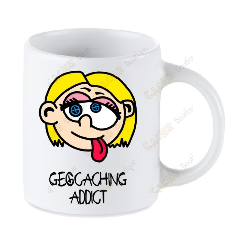 White 300 ml ceramic mug with "Geocaching Addict" - Girl illustration.