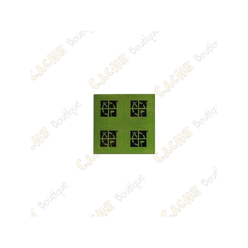 Lote de 4 mini stickers con el logo oficial del geocaching sobre fondo verde.